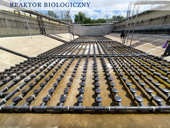 Z komór beztlenowych mieszanina ścieków i osadu czynnego dopływa do pompowni II°, skąd może być tłoczona do ośmiu równoległych reaktorów biologicznych osadu czynnego. Każdy z nich składa się z trzech stref: anoksycznej (beztlenowej), gdzie zachodzą procesy denitryfikacji, strefy przemiennego działania, która w zależności od potrzeb może pracować jako strefa nitryfikacji lub denitryfikacji oraz strefy tlenowej (strefa nitryfikacji). Natlenianie ścieków w reaktorach biologicznych realizowane jest poprzez zabudowane na dnie ruszty napowietrzające z dyskami membranowymi. |